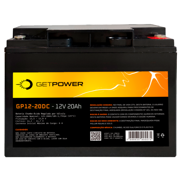 A Bateria Chumbo Ácida Estacionaria VRLA (Valve Regulated Lead Acid) da Série Getpower GP 12-20 DC utiliza a tecnologia de imobilização do eletrólito através dos separadores AGM (Absorbed Glass Mat, que é uma Manta de Lã de Vidro onde o ácido fica confinado.